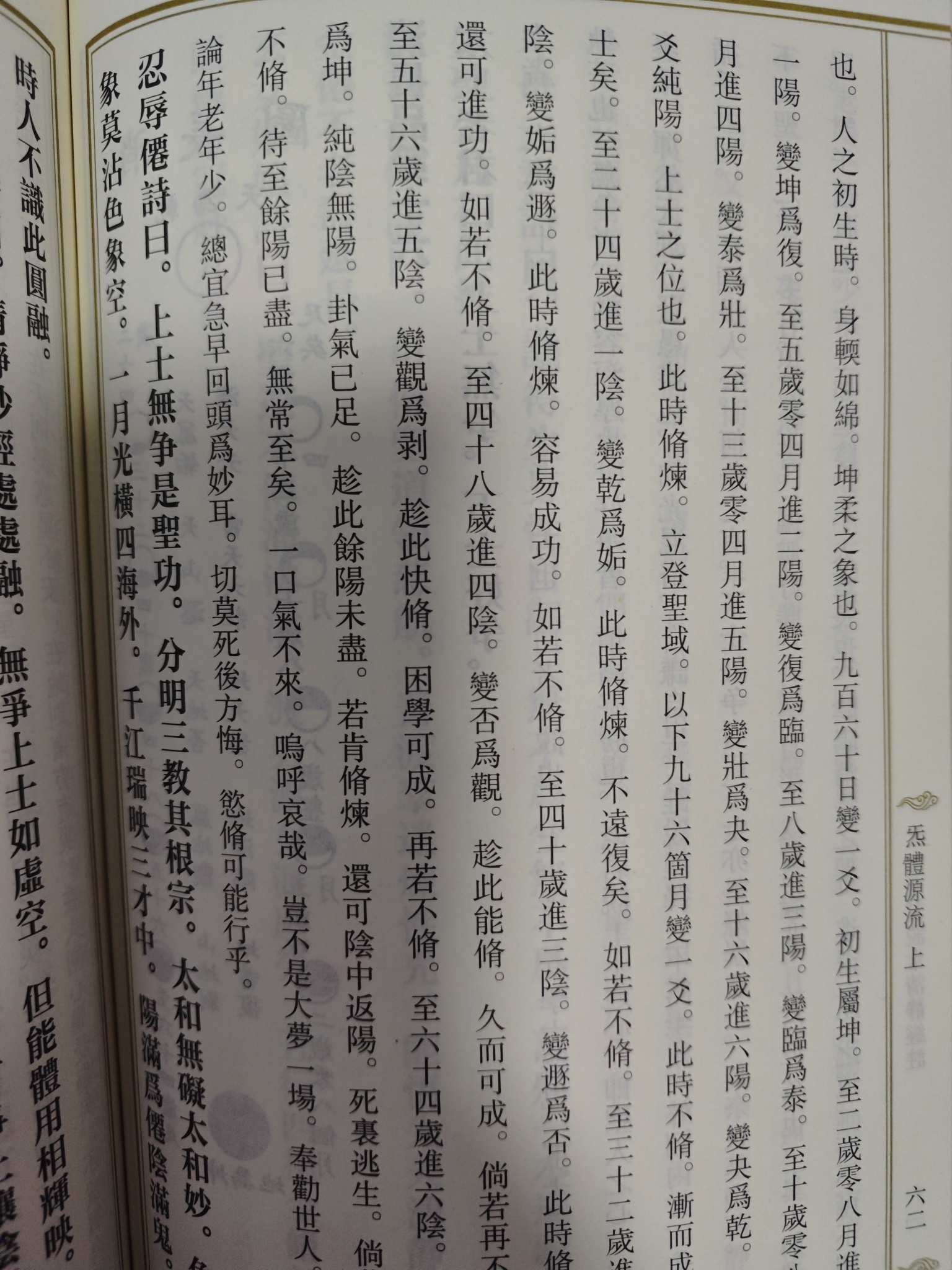 《炁體源流》之常清静经,消长品第十六写道,凡人修真要趁早,不能超过64岁,因为六十四岁,天癸已尽,体内卦气已变成纯阴了,再修真就来不及了。修身的目的就是把阴给修没了,炼出纯阳之体才能超脱登真